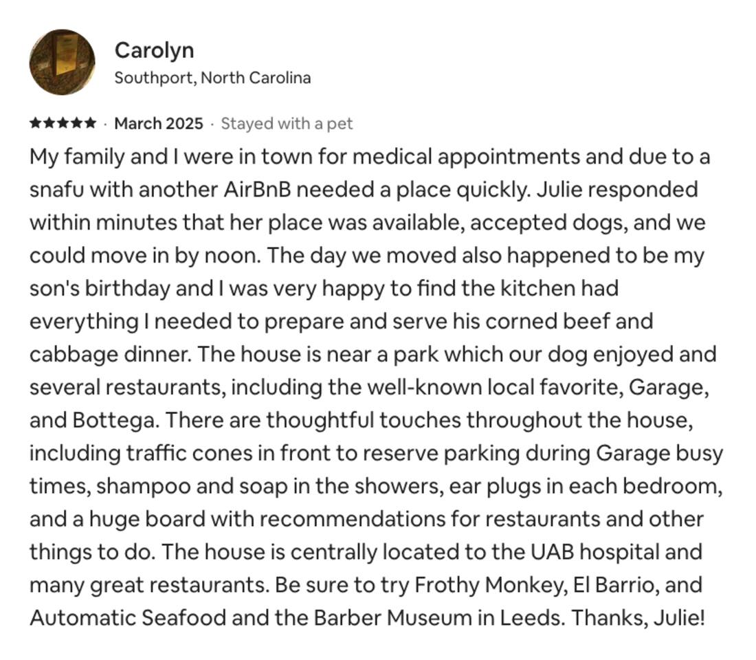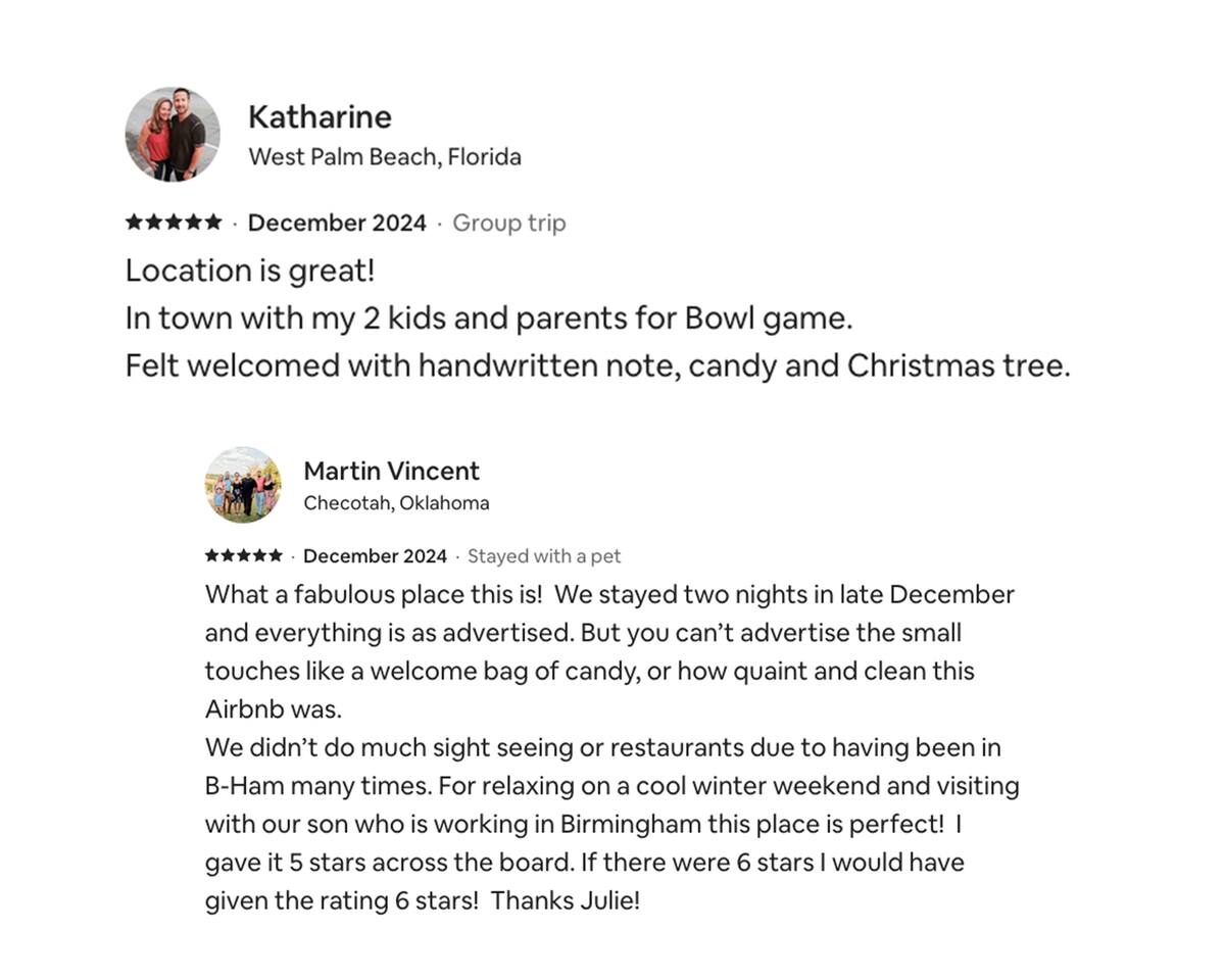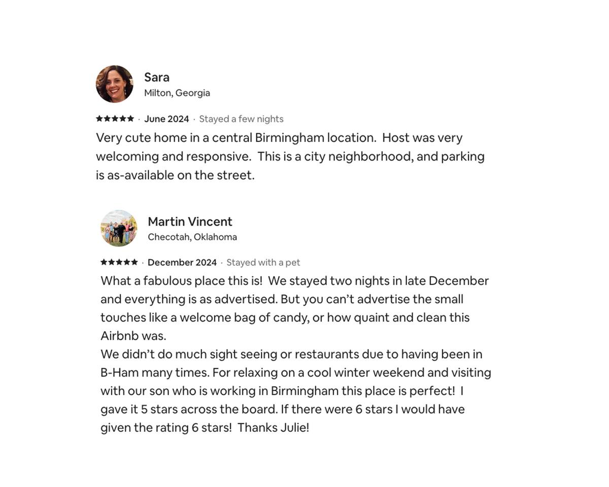 🌟 Neighborhood Guide — Five Points South, Birmingham Welcome to Five Points South, one of Birmingham’s most historic and walkable neighborhoods! Nestled just minutes from downtown and the University of Alabama at Birmingham (UAB) and major Hospitals, this area blends local charm, great food, and lively nightlife with tree-lined streets and classic Southern architecture. Whether you’re here for a weekend getaway, a work trip, a UAB visit, or for a Hospital, everything you need is right outside your door. 🍽️ Where to Eat From cozy cafes to elegant dining, Five Points South is a food lover’s paradise: Chez Fonfon – A charming French bistro perfect for lunch, wine, or a cozy dinner. Bottega Restaurant – Upscale Italian-Southern cuisine by Birmingham chef Frank Stitt. Surin West – Local favorite for Thai curries, sushi, and cocktails. Trattoria ZaZa – Italian-inspired brunch and espresso just blocks away. Ocean Birmingham – Sophisticated seafood and oysters with an inviting patio. Bandido Coffee & Domestique Coffee – Panache – Local roasters with great pastries and chill morning vibes. Big Spoon Creamery – Small-batch artisan ice cream for an evening treat. Insomnia Cookies – Warm cookies delivered late into the night. -------------------------------------- 🏥 Nearby Hospitals & Medical Centers If you’re visiting Birmingham for medical care or just want peace of mind knowing what’s nearby, here are the closest hospitals to your stay: 🏨 UAB Hospital – ~1.1 miles away (1802 6th Ave S) → Major regional hospital and trauma center with 24-hour emergency care. 🧑⚕️ Children’s of Alabama – ~1.2 miles away (1600 7th Ave S) → One of the top pediatric hospitals in the Southeast. 🏥 UAB Hospital–Highlands – ~1.8 miles away (1201 11th Ave S) → Full-service hospital known for orthopedic and rehabilitation services. 💙 St. Vincent’s Birmingham – ~1.6 miles away (810 St Vincent’s Dr) → Community-focused hospital offering a wide range of specialties and maternity care. -------------------------------------- 🍹 Nightlife & Drinks When the sun sets, the neighborhood comes alive: The Garage Café – A funky beer garden filled with antiques and outdoor tables. 5 Point Public House Oyster Bar – Craft beers, cocktails, and seafood in a relaxed atmosphere. Good People Brewing Co. – Local brewery near Regions Field, perfect for sampling Birmingham craft beers. Nick’s Lounge – A laid-back local dive bar with karaoke and live music. -------------------------------------- 🎨 Things to Do Explore, unwind, or get a taste of Birmingham’s culture — all within easy reach: Vulcan Park & Museum – Visit the city’s iconic iron statue and enjoy sweeping skyline views. Brother Bryan Park – A peaceful green spot for morning coffee or a quick jog. Railroad Park – Downtown’s 19-acre urban park, great for walks or picnics. Regions Field – Catch a Birmingham Barons baseball game just minutes away. UAB Campus – Home to art galleries, concerts, and cultural events. Red Mountain Park – Trails, tree-top adventures, and scenic overlooks only a short drive away. Birmingham Museum of Art – Free admission and an impressive collection of global art. McWane Science Center – Family-friendly exhibits, aquarium tanks, and an IMAX theater. Avondale Entertainment District – Just a 10-minute drive for food trucks, breweries, and live shows. -------------------------------------- 🛍️ Local Flavor & Culture Take a stroll around the Five Points Fountain, discover local murals, and browse independent shops and record stores along 20th Street South. The area has a creative, community-driven vibe — you’ll find friendly locals, dog-walkers, and plenty of patios perfect for people-watching. 💡 Pro Tip for Guests Five Points South is lively and walkable, especially on weekends. If you prefer quiet nights, we provide earplugs and sound machines in the Honeysuckle House to keep things peaceful.