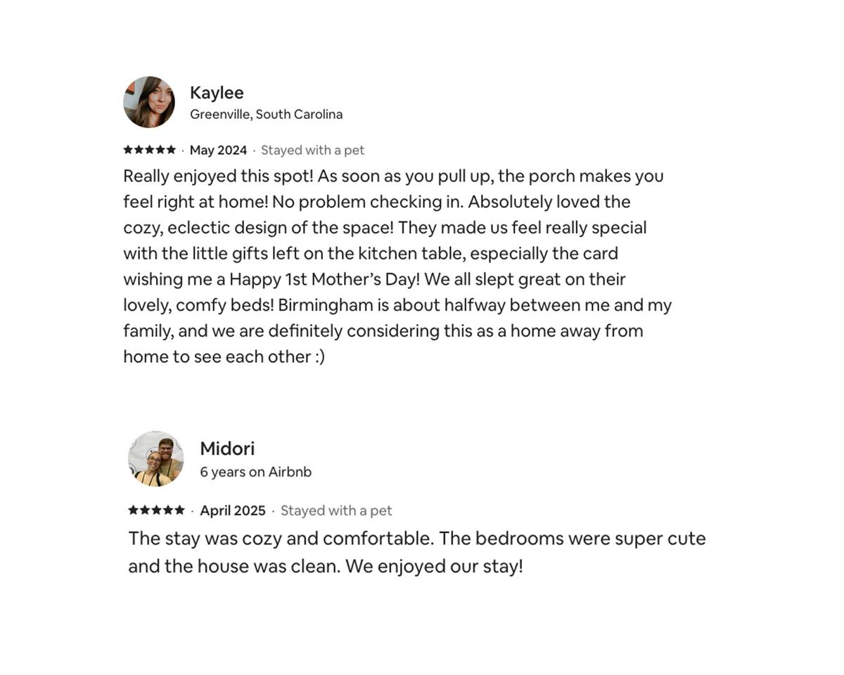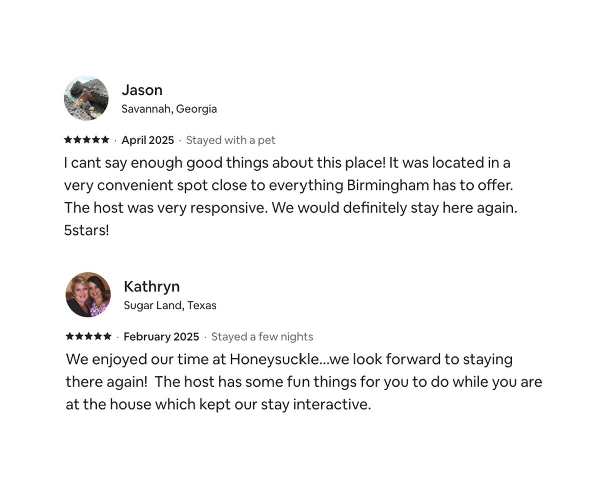 🏡 About this space – Honeysuckle House Beautifully renovated half-duplex in a historic Birmingham neighborhood. The Honeysuckle House has been a very successful Airbnb for more than 4 years with over 315 ⭐️ 5 star reviews. While we are the new owners, we aim to provide the same exceptional service and hospitality. See previous reviews in the photo gallery. Sleeps up to 8 guests — perfect for families and groups Prime location: close to UAB, downtown, Garage Cafe & Bar, and top restaurants Living Room: large sectional, 65" TV, board games, desk, and craft supplies for kids Kitchen: fully equipped with stainless steel appliances, cookware, spices, Keurig & coffee pot (pods & grounds provided), and a large dining table Laundry: washer and dryer included with detergent and dryer sheets Bedrooms (upstairs): Master: California king with memory foam mattress, large closet, TV Second: Queen bed with memory foam mattress, TV Third: Twin bed + extra twin airbed, dresser (perfect for kids) Bathrooms: stocked with essentials (shampoo, conditioner, body wash) Downstairs: bathtub/shower combo Upstairs: shower only City noise note: close to the highway — earplugs and sounds machine provided for a peaceful sleep Parking: free street parking (can be busy near Garage Cafe/Bar) Pet-friendly: $50 per pet - Must be up to date with vaccinations and no fleas. *** Parking *** Free street parking available. Since it is free public parking, there is no guarantee that there is a spot available. Most of the time you will have 2 spots right in front of the house however since there is a restaurant down the street, it does get busy. If the spots in front of the house are not available, you may need to park down the street a bit. We would like to but cannot guarantee parking in front of the house.